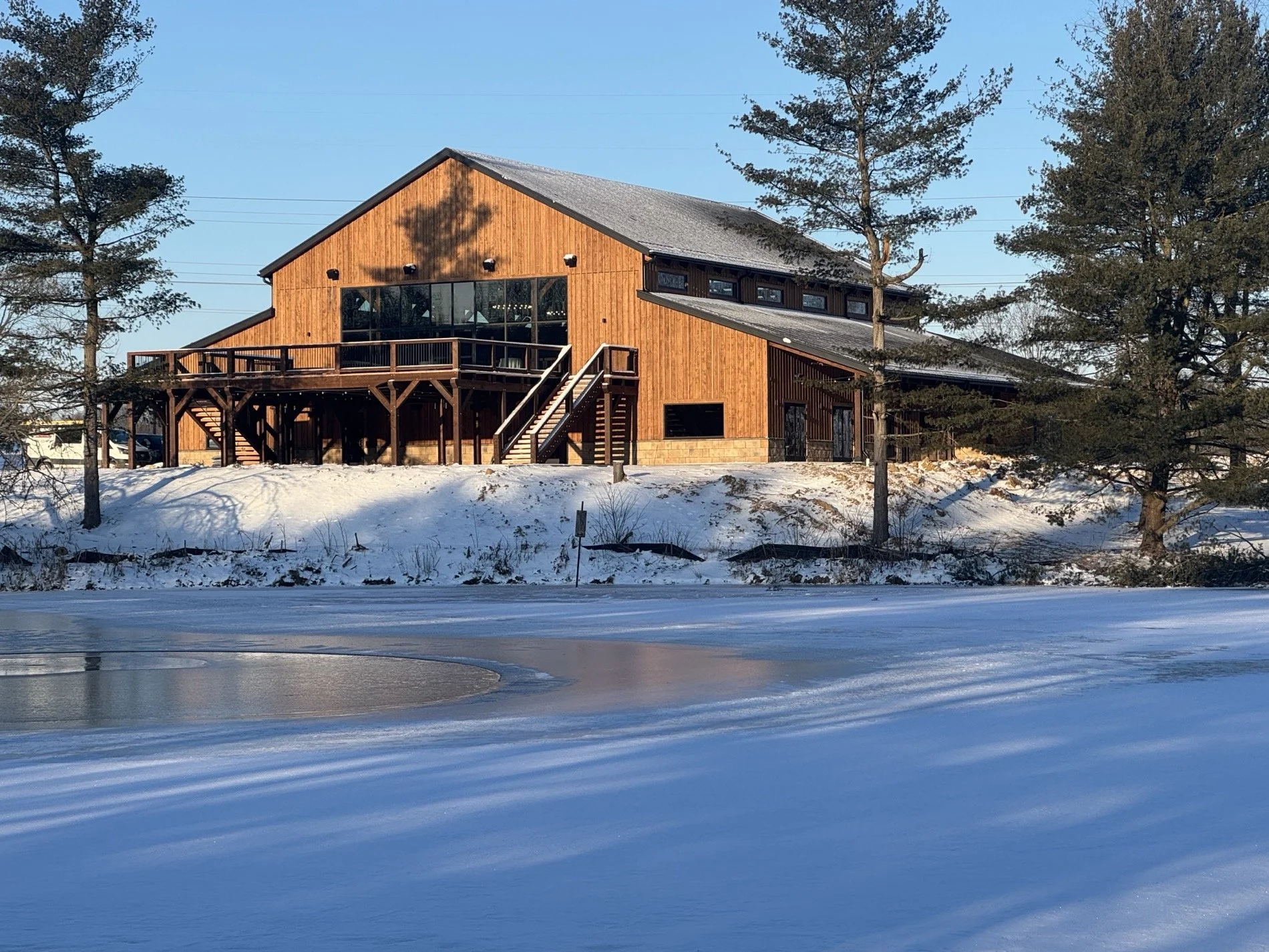 Nature Valley Lodge provides a warm and elegant escape for winter weddings. Our spacious 10,000-square-foot lodge boasts a cozy, modern barn-style design featuring exposed beams, floor-to-ceiling windows, and sweeping views of snow-covered woods and the frozen lake.